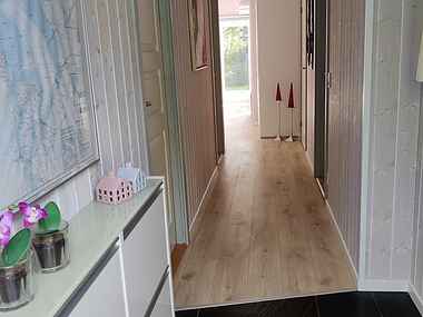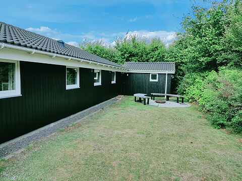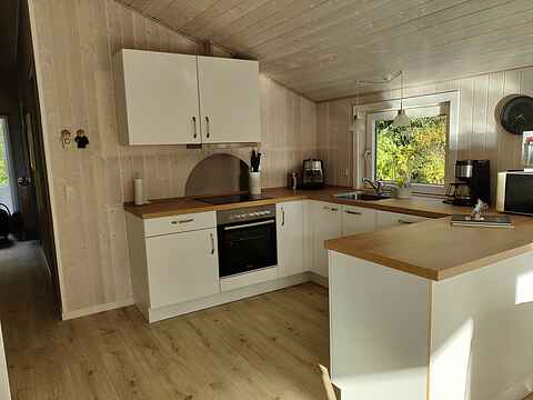 Dette dejlige feriehus er særdeles velindrettet, og pladsen er godt udnyttet. Det dejlige, åbne køkken er sammenhængende med en skøn stue. I stuen, der er godt møbleret med moderne møbler, er der brændeovn, TV, CD og radio og en spillekonsol.