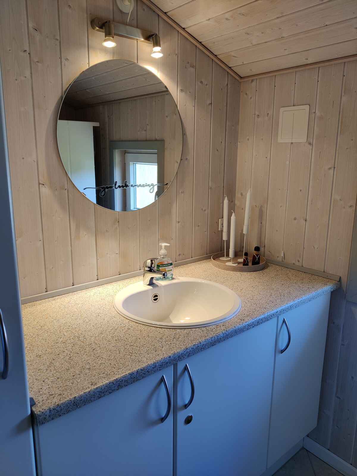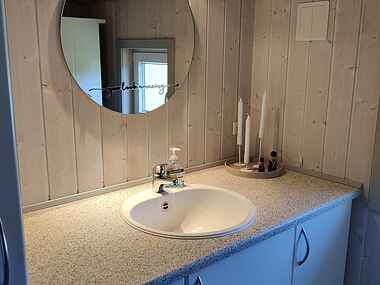 Badeværelset er udstyret med spa, bruseniche og toilet, og hertil er der yderligere et gæstetoilet.