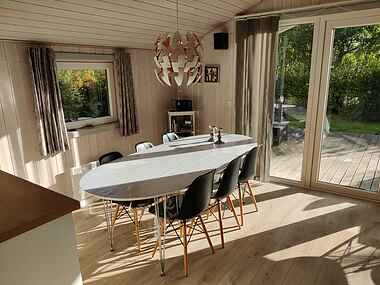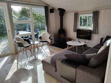 Dette dejlige feriehus er særdeles velindrettet, og pladsen er godt udnyttet. Det dejlige, åbne køkken er sammenhængende med en skøn stue. I stuen, der er godt møbleret med moderne møbler, er der brændeovn, TV, CD og radio og en spillekonsol.