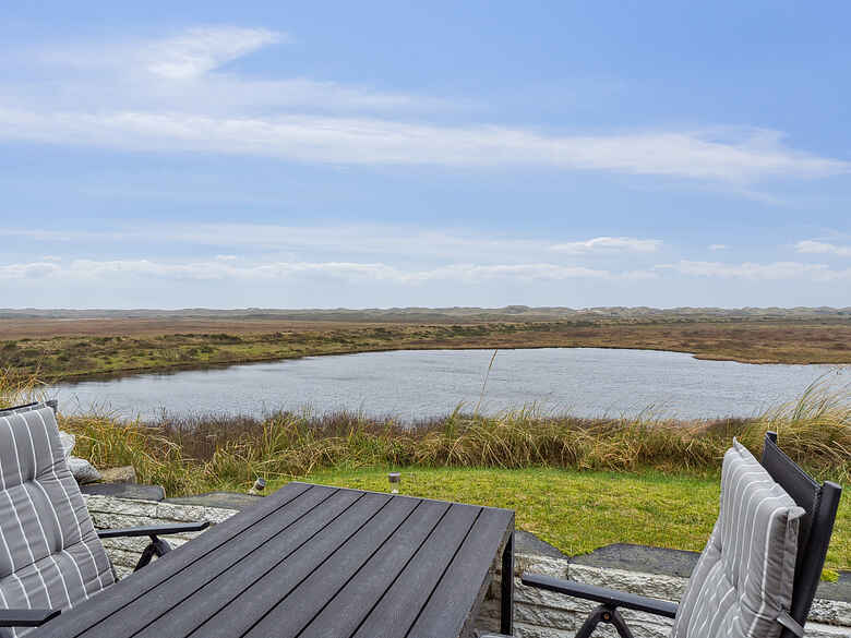 Fra terrassen kan udsigten over landskabet nydes i læ og uden forstyrrelser. Her kan dagen starte med frisk luft eller afsluttes i ro, mens lyset skifter over vand, eng og himmel.