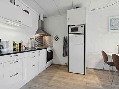 Indretningen er enkel og funktionel med køkken og opholdsrum i åben forbindelse. Her er plads til at samles over måltider eller en stille aften efter en dag udendørs. Store vinduer giver et fint lys og skaber nærvær til omgivelserne.