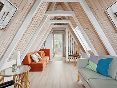 Fra stuen på første sal er der udsigt over havet. Herfra kan man følge dagens skiftende lys og se solen forsvinde bag horisonten. I stueplan ligger den lyse udestue, der forlænger sommeren og inviterer til måltider eller stille stunder, uanset vejret.