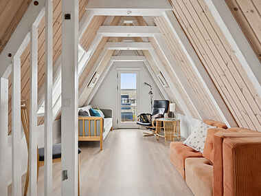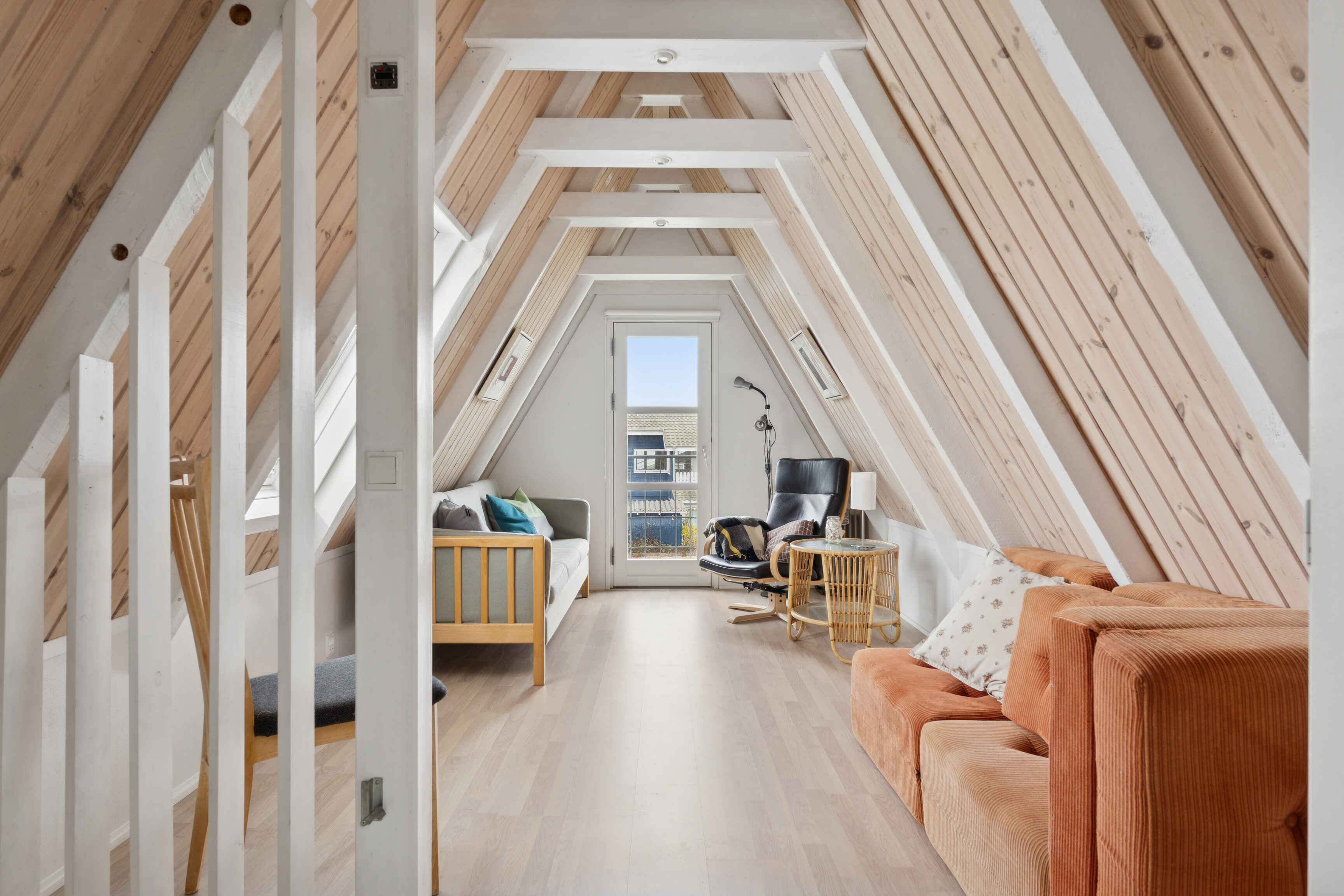 Fra stuen på første sal er der udsigt over havet. Herfra kan man følge dagens skiftende lys og se solen forsvinde bag horisonten. I stueplan ligger den lyse udestue, der forlænger sommeren og inviterer til måltider eller stille stunder, uanset vejret.