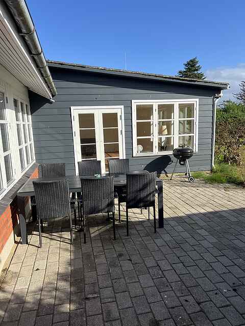 Udenfor finder I en privat have, hvor der er plads til leg, afslapning og måltider i det fri. Her står både grill og havemøbler, så sommerdagene nemt kan nydes udendørs fra morgen til aften.