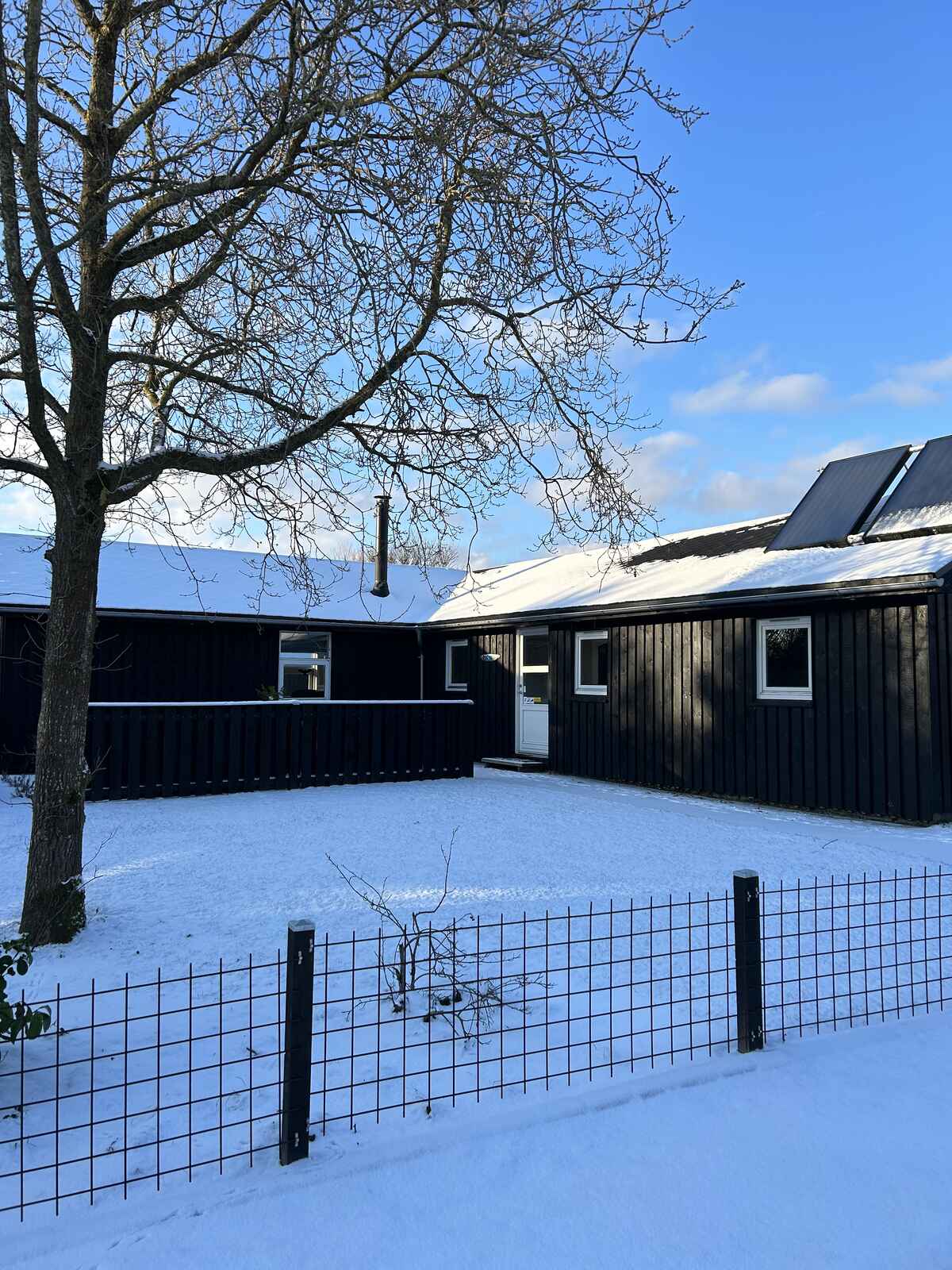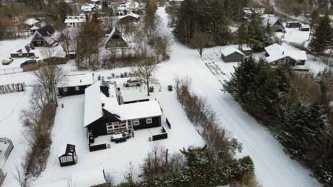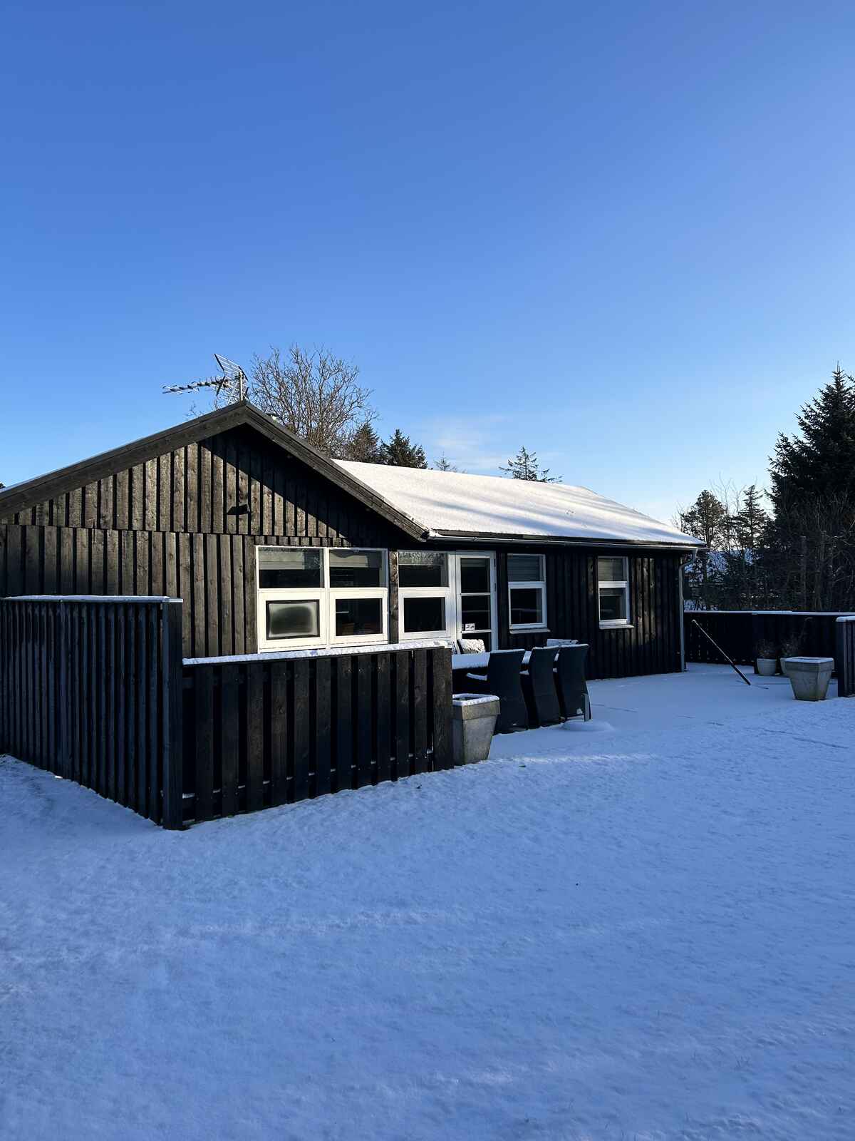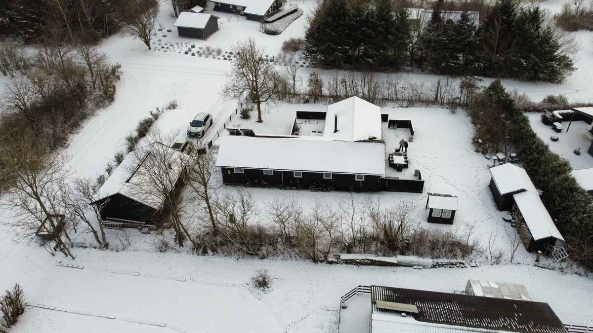 Udenfor er der havemøbler, liggestole og en grill og en stor åben terrasse på 100 m2 samt p-plads til bilen.