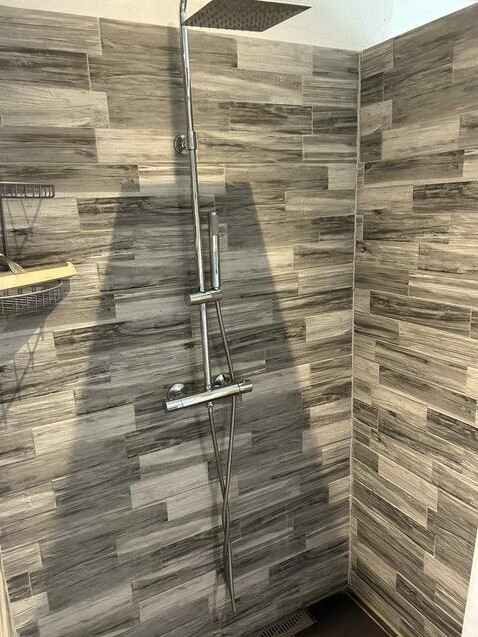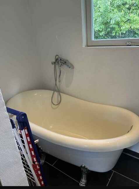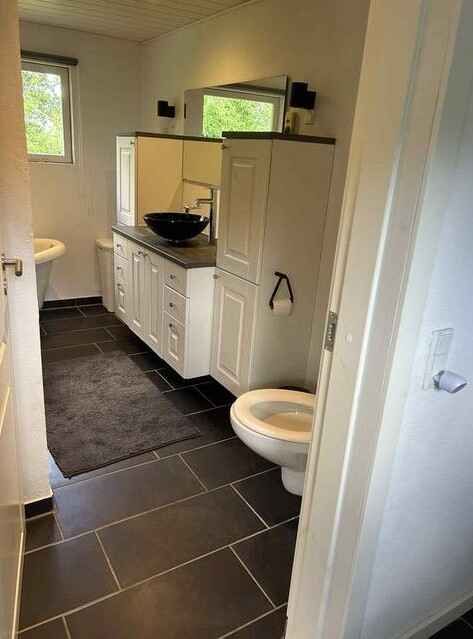 Badeværelse med både brusebad og karbad samt varme i gulvet. Der er vaskemaskine til rådighed.