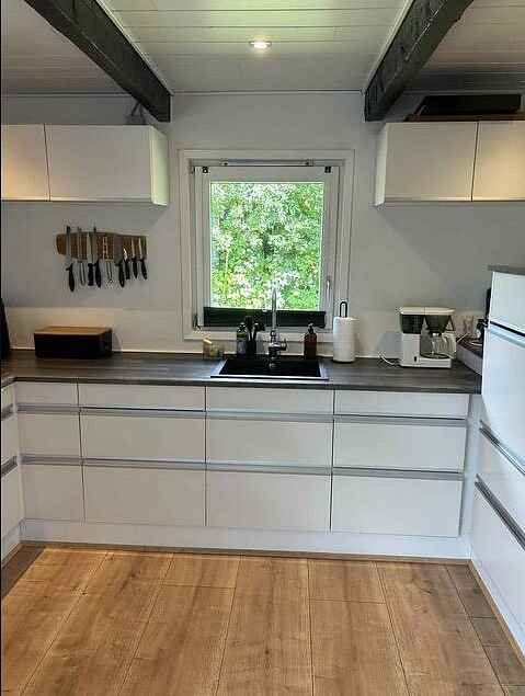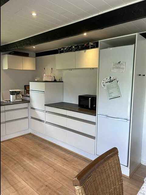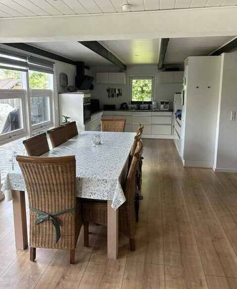 Lækkert køkken i åben forbindelse med stuen. Køkkenet er veludstyret med bl.a. opvaskemaskine og mikroovn. Her er en dejlig stor spiseplads tæt på køkkenafdelingen inkl. en barnestol.