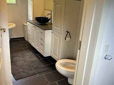 Badeværelse med både brusebad og karbad samt varme i gulvet. Der er vaskemaskine til rådighed.