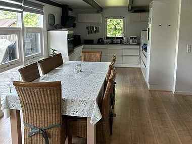 Lækkert køkken i åben forbindelse med stuen. Køkkenet er veludstyret med bl.a. opvaskemaskine og mikroovn. Her er en dejlig stor spiseplads tæt på køkkenafdelingen inkl. en barnestol.