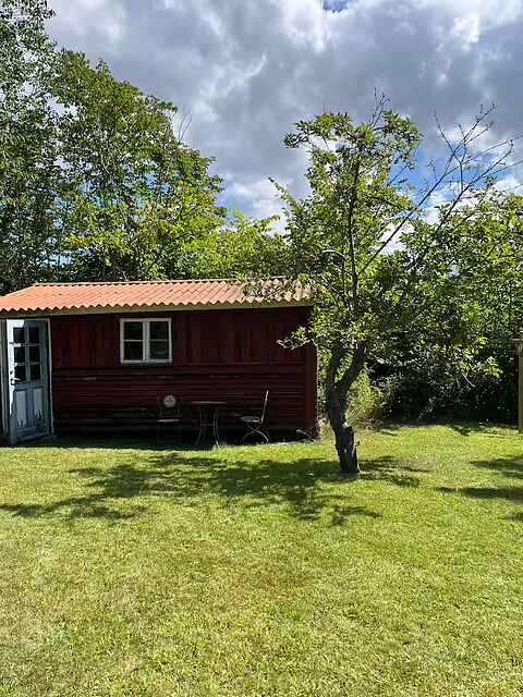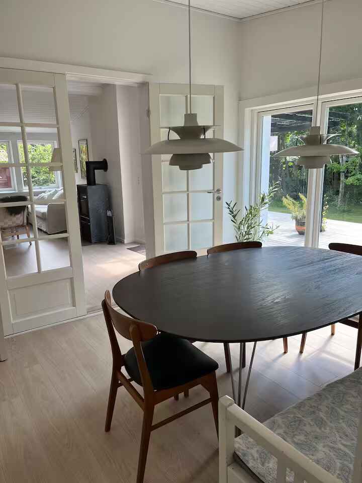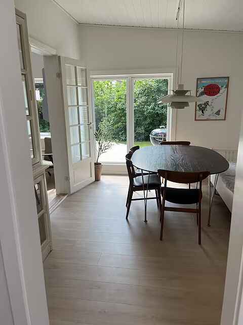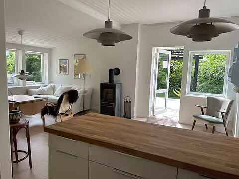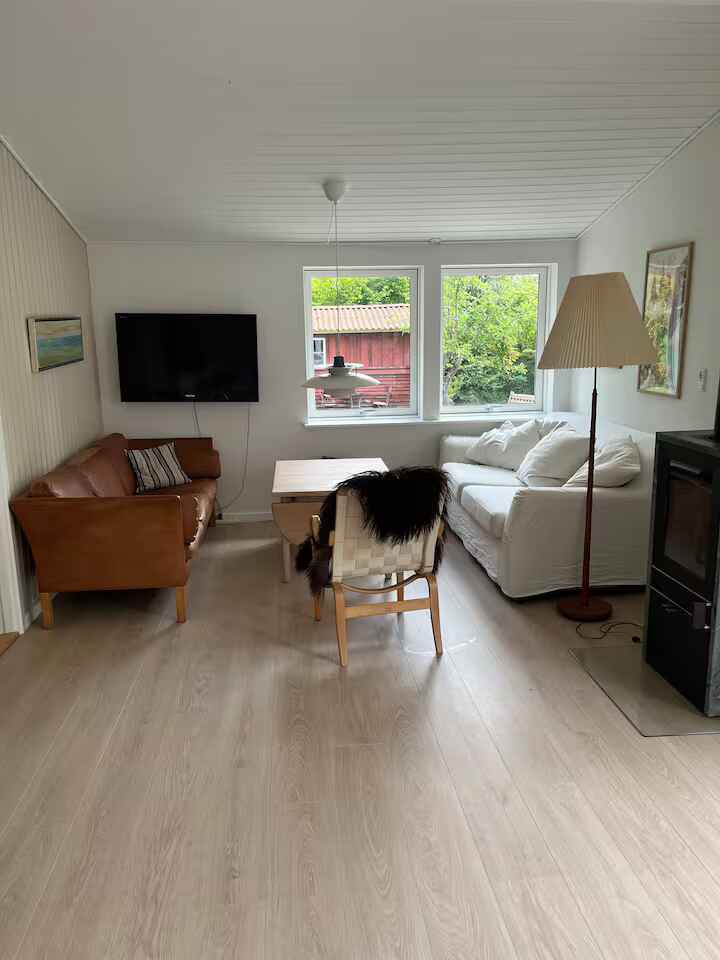 Indretningen er enkel og funktionel med et fuldt udstyret køkken, spiseplads og en hyggelig stue med pejs. Her er rammerne for fælles måltider og rolige aftener efter en dag ude.