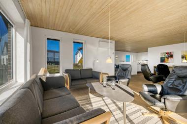 Efter at have hentet nøglen på kontoret i Vrist starter en smuk tur af små snoede veje til Bovbjerg. Allerede på lang afstand tårner Bovbjerg Fyr sig op. I det smukke, bakkede landskab er man ikke i tvivl om, at man nærmer sig noget unikt. Parker bilen i carporten og start udpakningen. En dejlig entré byder velkommen, og allerede her er man ikke i tvivl om, at dette hus og dens beliggenhed er noget ganske særligt. Huset er 150 m2 og har 4 store soveværelse (1DS, 1DS, 1DS, 2ES) med god skabsplads i alle soverum. 2 af soverummene har udsigt til Vesterhavet. Træd ind i den hyggelige opholdsstue som er udstyret med helt nye, moderne møbler. Der er masser af siddepladser i de flotte lædermøbler, smart-TV, som har indbygget danske og tyske Tv-programmer, radio og mulighed for streamings tjenester, et flot spisebord med siddepladser til alle og den unikke panoramaudsigt til Vesterhavet fuldender oplevelsen. En varmepumpe søger for, at alle kan holde varmen på alle årstider til en billig pris. Åbent, godt udstyret køkkenhjørne med alt i hvidevarer, opvaskemaskine, mikroovn, komfur med keramiske kogeplader og køleskab med fryseboks. Nyd et glas rødvin når der laves mad i dette nye køkken. Huset har praktiske trægulve i såvel opholdsrum som soverum. Stort badeværelse md gulvvarme, toilet, håndvask, bruseniche og 2-personers spabad. Ekstra badeværelse med gulvvarme, toilet, håndvask og bruser. Baggang med vaskemaskine, tørretumbler og ekstra bordplads. Ikke ryger hus. Max 1. husdyr er tilladt. Har man en el-bil eller hybrid så findes der et CEE-ladestik ved huset.