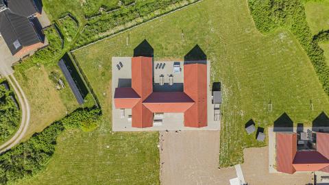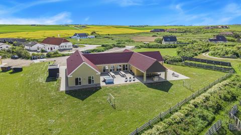 Der er masser af plads på den 8.600 m2 store grund og på det pragtfulde terrasseanlæg er der masser af muligheder for en plads i solen eller måske i skyggen, da anlægget bl.a. indeholder 38 m2 terrasse, som er overdækket. Også her er udsigten unik og der er tænkt på det meste. Stor fastmonteret grill, masser af havemøbler og liggestole og der er også tænkt på de 4 benene venner, som har fået deres helt egen hundegård. Hvad med en gang fodbold på den dertil anlagte fodboldbane ved siden af huset. En tur i den udendørs spa i hjørnet af terrassen gør oplevelsen unik og specielt på de mørke aftener med den klare stjernehimmel. En unik oplevelse som er ren terapi for sjæl og krop. Huset ligget tæt ved Jens Søndergårds Museum og ikke langt fra Bovbjerg Fyr. Nyd en fantastisk gå- eller løbetur på stien, som er anlagt helt ude på kanten af Bovbjerg Klint med unik udsigt over Vesterhavet. Oplev at Vesterhavet hver dag fortæller en ny historie. Besøg de mange attraktioner og oplevelser, som nås indenfor max. 30 min. eller besøg fiskerbyen Thyborøn eller den dejlige handelsby Lemvig med masser af specialbutikker. I Sommermånederne kan de mest nødvendige indkøb klares hos Bovbjerg Camping. Det perfekte rummelige hus til 32 personer beliggende i et unikt morænelandskab, som byder på masser af bakker, muligheder og romantik.