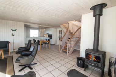 Gulvene i huset er belagt med klinker, dog er soverummene med trægulve. På 1. sal er et af husets badeværelser, som er med toilet, håndvask og bruser. Her er der desuden 2 rummelige soveværelser, som er med 1DS + 1DS. Desuden er der stue på 1. sal, som er med panoramavinduer med udsigt over Vesterhavet, komfortable møbler og fladskærms-TV. På 1. sal er der udgang til en terrasse, som har en fantastisk udsigt både over området men ikke mindst over Vesterhavet, her kan man rigtig sidde og nyde solnedgangen fra første parket. I stueetagen er der 3 soverum med 1DS + 1DS + 1 køjeseng. Godt udstyret køkken med keramsik komfur, opvaskemaskine, mikroovn og 20 l fryser. Dejlig stueafdeling med fladskærms-TV med DR1 samt parabol med tyske programmer, DVD samt stereoanlæg. Komfortable møbler og skøn brændeovn som kan nydes på alle årstider. Fra stuens panoramvinduer er der udsigt til Vesterhavet. Badeværelse med toilet, håndvask og bruser samt gulvvarme og lækkert spabad. Bryggers med vaskemaskine, tørretumbler og 120 l skabsfryser. Nyt luft til vand anlæg gør huset særdeles energivenligt og bevirker også et billigere forbrug. Vand og energiomkostninger Sommer ca kr. 1000 til kr. 1500. Vinter fra kr. 2900 til kr. 3400 afhængig af vejret og personantal. Græsplænen hører ikke til huset. 1 husdyr er tilladt. Har man en el-bil eller hybrid så findes der et CEE ladestik ved huset. Ikke rygerhus.