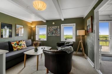 Den hyggelige stue er møbleret med læder- og polstermøbler og har TV med både danske og tyske kanaler samt lynhurtigt fibernet – ideelt til både afslapning og underholdning. Spisestuen har spisebord og direkte udgang til terrassen.