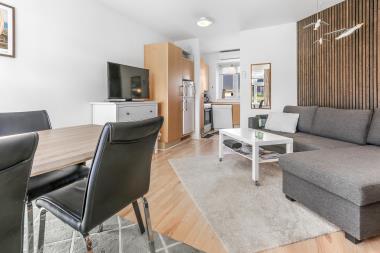 Indenfor finder I en lys og funktionel indretning, hvor opholdsstue og køkken er kombineret, så I kan være sammen om både madlavning og hygge. Stuen er indrettet med en komfortabel sofa, der også kan bruges som sovesofa, samt tv med danske kanaler og en dab-radio. Køkkenhjørnet er veludstyret med blandt andet keramiske kogeplader, ovn, mikroovn, opvaskemaskine og køleskab, så det er nemt at tilberede måltiderne. Badeværelset har bruser, toilet og håndvask, og i huset er der desuden vaskemaskine og en energivenlig varmepumpe.