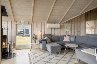 Den lyse og hyggelige stue er indrettet med komfortable møbler, TV med både danske og tyske kanaler, samt brændeovn, der skaber ekstra feriestemning på kølige dage. Huset opvarmes desuden med en energivenlig varmepumpe.