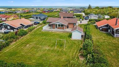 Fra stuen er der direkte adgang til en delvist overdækket terrasse med havemøbler, solvogne og grill. Terrassen byder på gode læforhold, og møblerne kan nemt flyttes rundt, så man altid kan finde en solrig plet eller et beskyttet hjørne. Til familiens yngste er der gynger i haven.