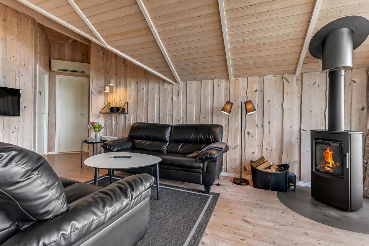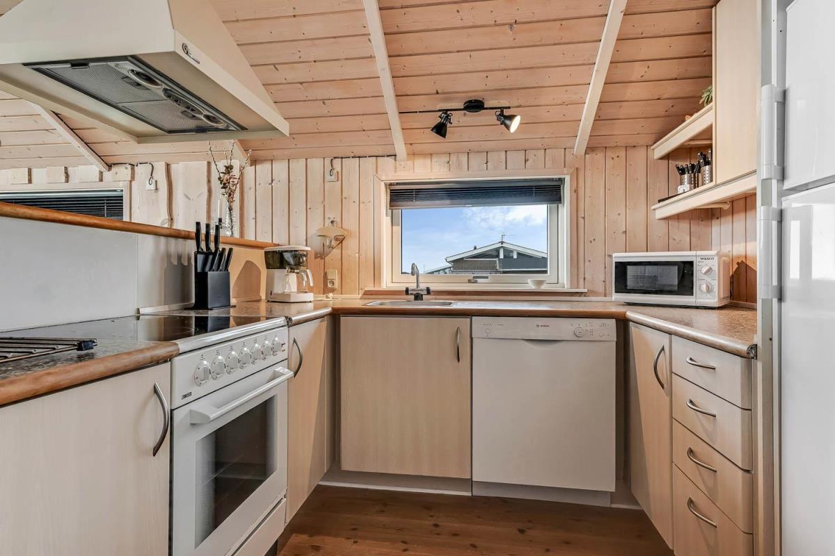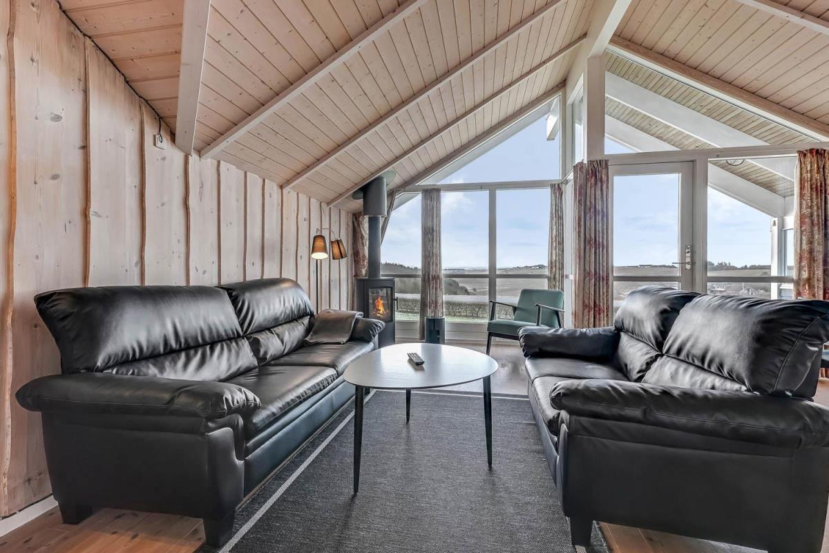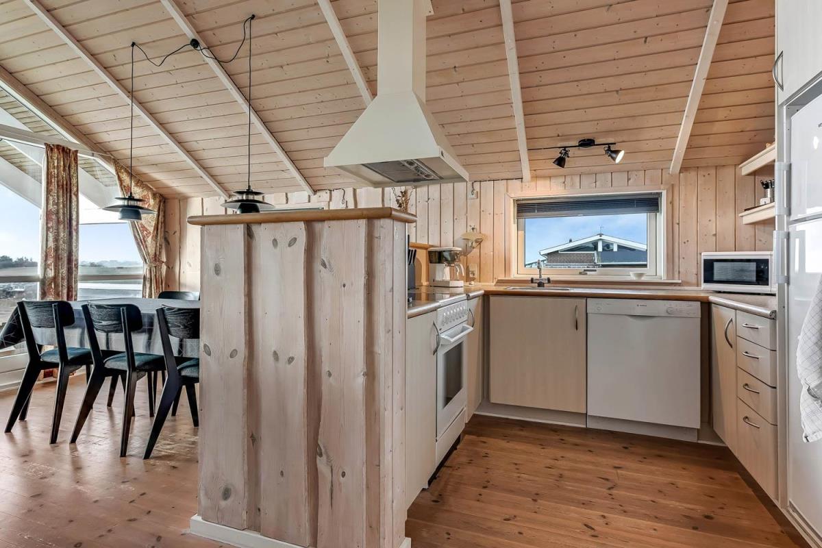 Indretningen er lys og indbydende med store vinduer, der fremhæver den imponerende udsigt. Loft til kip, moderne møbler, vægge og lofter i ludbehandlet træ samt trægulve overalt skaber en varm og hyggelig atmosfære. Køkkenafdeling med glaskeramisk komfur, køle-/fryseskab, opvaskemaskine og miniovn.