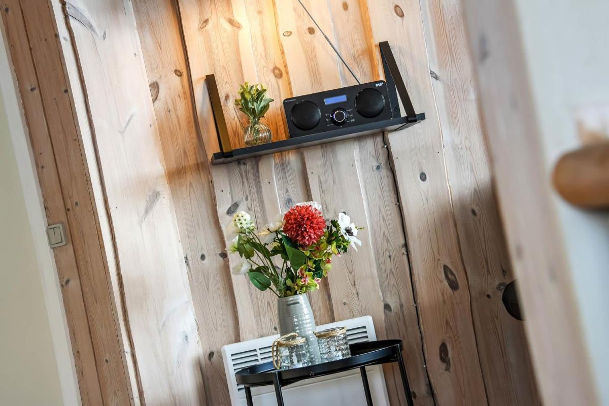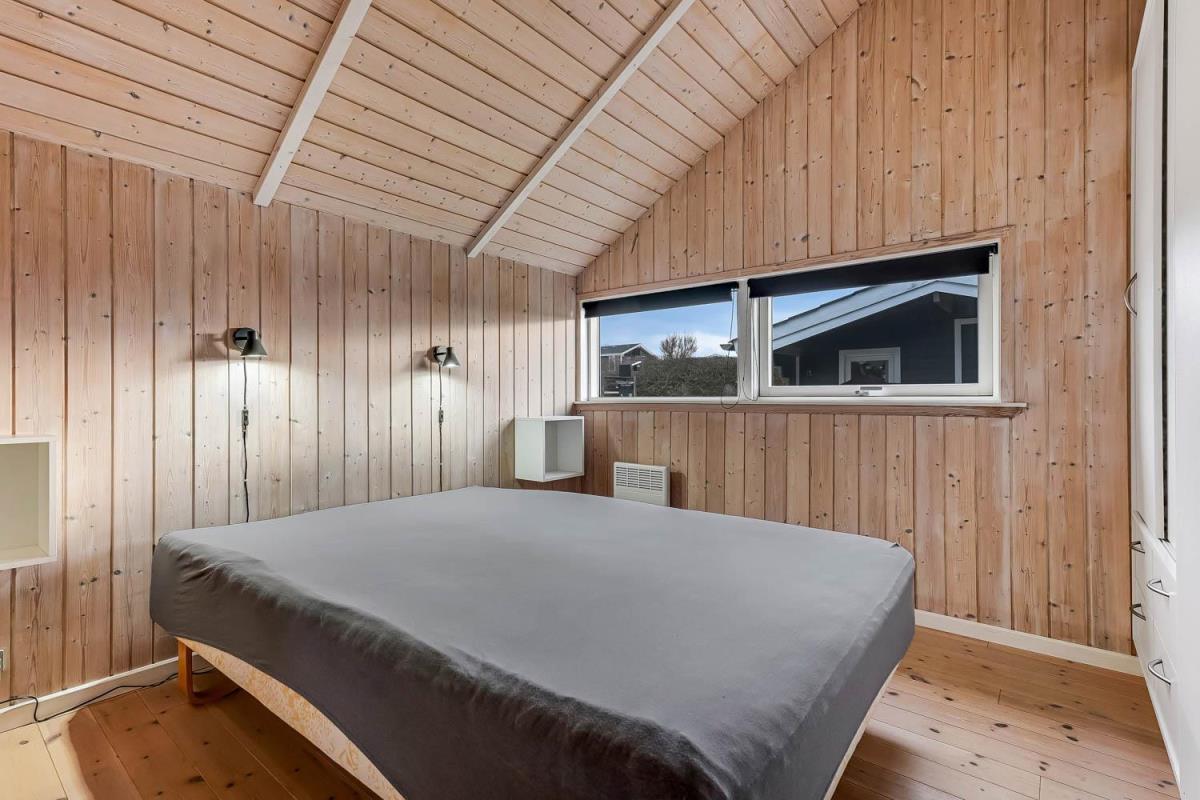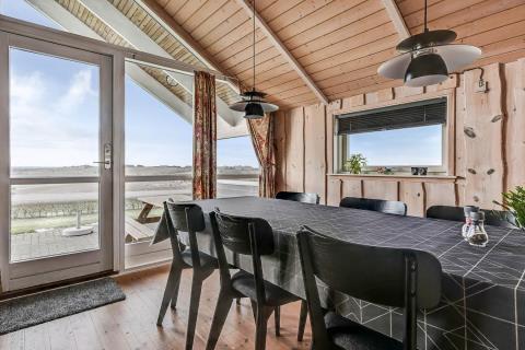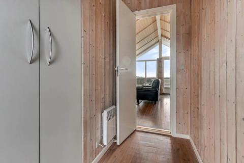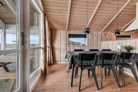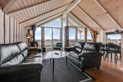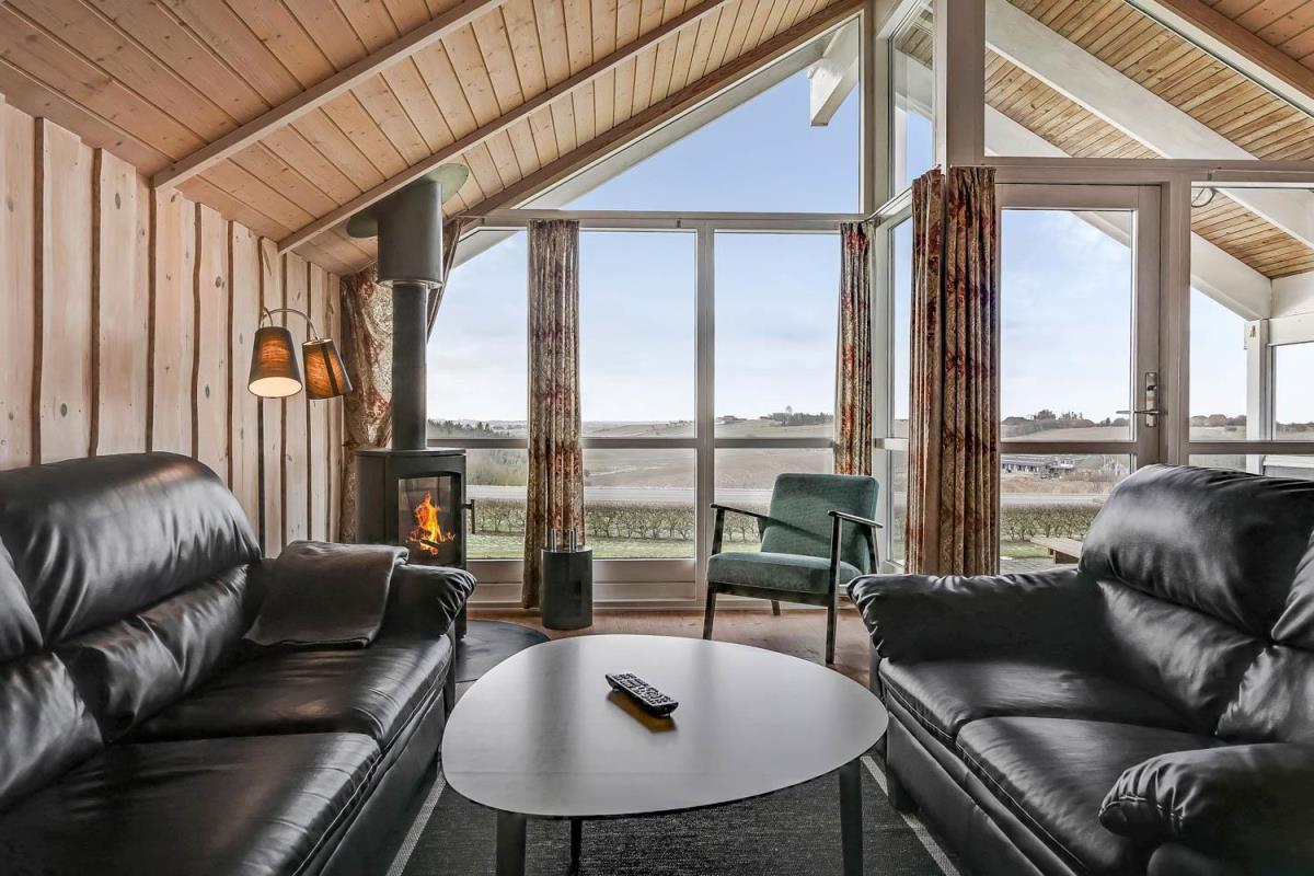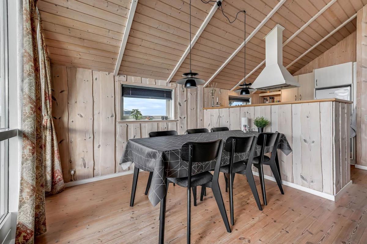 Indretningen er lys og indbydende med store vinduer, der fremhæver den imponerende udsigt. Loft til kip, moderne møbler, vægge og lofter i ludbehandlet træ samt trægulve overalt skaber en varm og hyggelig atmosfære. Køkkenafdeling med glaskeramisk komfur, køle-/fryseskab, opvaskemaskine og miniovn.