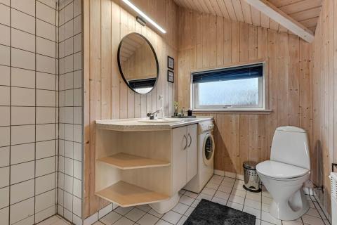 Huset er særdeles veludstyret med vaskemaskine, varmepumpe og brændeovn. Badeværelse og bryggers har klinkegulv.