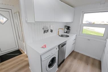 Samtalekøkkenet er udstyret med keramiske kogeplader, emhætte, indbygningsovn, mikroovn, opvaskemaskine, vaskemaskine og køleskab med fryseboks. Badeværelset har bruser, toilet, håndvask og linoleumsgulv med gulvvarme.