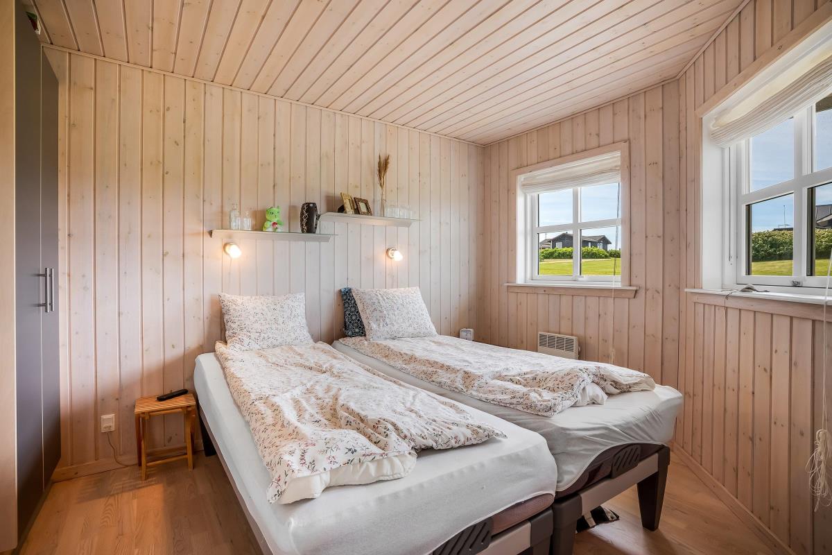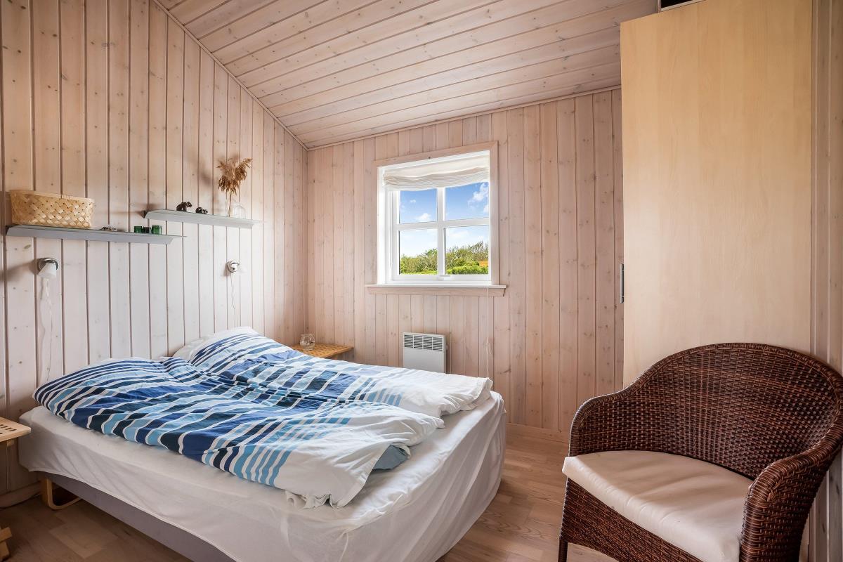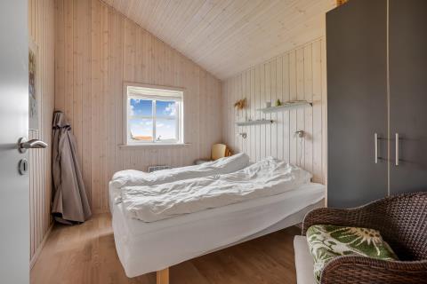 Huset er lyst og velholdt og rummer 3 soveværelser, alle med dobbeltseng og trægulve, hvilket skaber en hyggelig og varm atmosfære.