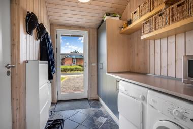 Den rummelige entre har god plads til overtøj og fodtøj samt vaskemaskine, tørretumbler og bordplads – praktisk til både korte og længere ophold.