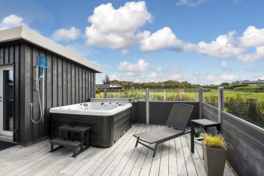 Huset ligger på en ca. 865 m² stor indhegnet grund, højt og ugeneret beliggende på en rolig stikvej. Velholdt indehegnet grund med trampolin, gynge og kun 700 meter fra stranden. Fantastisk, delvist overdækket og indhegnet terrasseanlæg med havemøbler, grill og liggestole. Her er også et skønt udendørs spabad, hvor man i al slags vejr kan sidde og nyde udsigten og om aftenen den stjerneklare himmel. Her kan der altid findes en plads i solen samt pragtfuldt kig til Limfjorden. Havemøbler, solvogn og grill kan flyttes rundt på terrassen efter behag. Også på bagsiden af huset er der en dejlig terrasse med havemøbler og udsigt over landskabet. Fra huset findes der stisystemer, som på få minutter fører direkte ned til fjord, badestrand og badebroer. Nær ved huset ligger også den nye flotte naturlegeplads, som er lavet i naturmaterialer og hvor der bl.a. er rutsjebaner, gynger og meget andet. Her findes også iskiosk og restaurant, som har åbent i sæsonen. Der er i øvrigt kun ca. fire km til Lemvig by, som er en livlig handelsby med mange butikker, fiskerestaurant, biograf, skaterbane, museum mm.