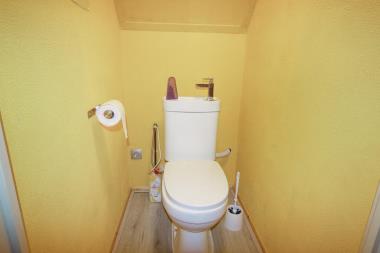 Fra køkkenet er der en trappe til 1. sal. Her er der 2 soveværelse (2ES og 1DS). Lille ekstra toilet.