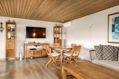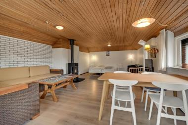 Det første hus har faktisk 2 stuer. Stuen nedenunder kan betegnes som spisestuen og herfra har man en god udsigt over haven, så man kan holde øje med børnene. Her er der 2 spiseborde til henholdsvis 6 og 4 personer, brændeovn, sofagruppe med sofabord samt fladskærm med både dansk og tysk TV. Internet. Køkkenet har opvaskemaskine, ovn, mikrobølgeovn, køle-fryseskab samt komfur og emhætte. Hertil er der også et køkkenbord hvor man kan sidde at hyggesnakke. I stueetagen er der endvidere et badeværelse med gulvvarme som indeholder en bruser, håndvask og toilet. Sovepladserne fordeler sig på 2 køjesenge og en dobbeltseng.