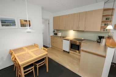 Enkel indrettet ferielejlighed beliggende på 1. sal med balkon med havemøbler. 1 soverum: 1DS + 1S og gulvtæppe. Kombineret køkken og stue. Køkkenet er indrettet med glaskeramisk komfur, emhætte, køleskab med lille frostbox, opvaskemaskine, mikroovn og linoleumsgulv. Badeværelse med toilet, håndvask og bruser. Stue med kabel-TV, læder og polstermøbler og gulvtæppe. Sofaen i stuen kan slåes ud så der kan blive 2 sovepladser. Trappen til 1. sal består af 21 trappetrin.