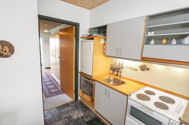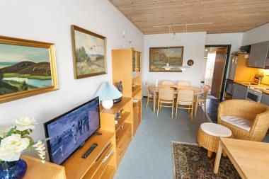 Personlig og pæn indrettet ferielejlighed til 2 personer beliggende på 1. sal. Kombineret stue og køkkenafdeling. Køkkenet er indrettet med el-komfur, køleskab med 10 l frostboks, opvaskemaskine, emhætte og linoleumsgulv. Stuen er indrettet med kabel-TV, DVD, radio, polstermøbler og gulvtæppe. Badeværelse med toilet, håndvask og bruser. 1 soverum: 1DS + 1S og gulvtæppe. Fra stuen er der udgang til overdækket balkon med havemøbler. Trappen til 1. sal består af 40 trappetrin.