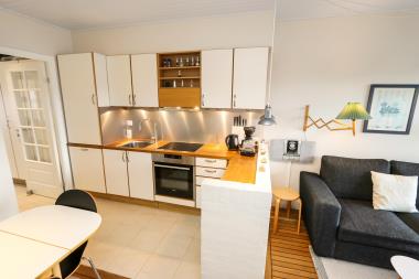 Pæn ferielejlighed beliggende på 1. sal med balkon og havemøbler. Kombineret stue og køkken. Køkkenet er indrettet med glaskeramisk komfur, køleskab med lille frostbox, emhætte og klinkegulv. Stuen er med kabel-TV, læder og polstermøbler og trægulv. Sofa i stuen kan slåes ud så der blir 2 sovepladser. 1 Soverum: 1DS + 1ES med ekstra TV og trægulv. Badeværelse med toilet, håndvask og bruser. Lejligheden er rigtig pæn og velholdt. Trappen til 1. sal består af 40 trappetrin.