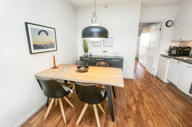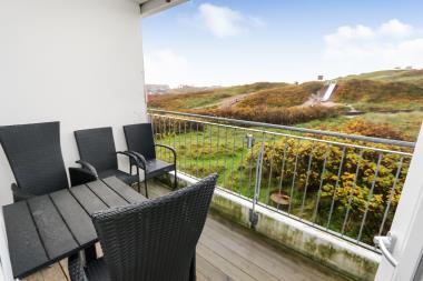 Meget pæn og moderne indrettet ferielejlighed beliggende på 1. sal. Kombineret stue og køkken. Stuen er indrettet med læder og polstermøbler, Kabel-TV, DVD og pergogulv. Køkkenet er med glaskeramisk komfur, køleskab med 10 l frostboks, mikroovn, opvaskemaskine, emhætte og pergogulv. 1 soverum: 1DS og pergogulv. Badeværelse med toilet, håndvask og bruser. Fra stuen er der udgang til overdækket balkon med havemøbler. Trappen til 1. sal består af 24 trappetrin.