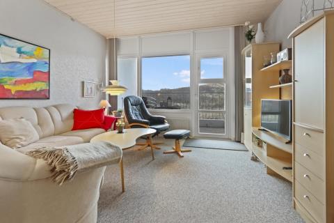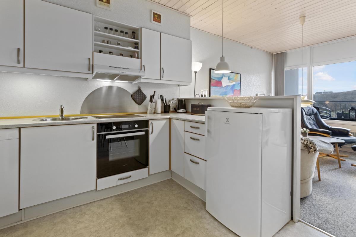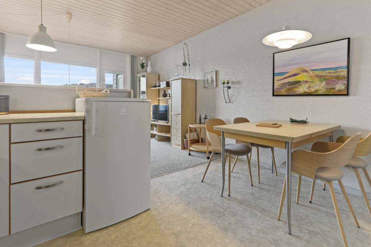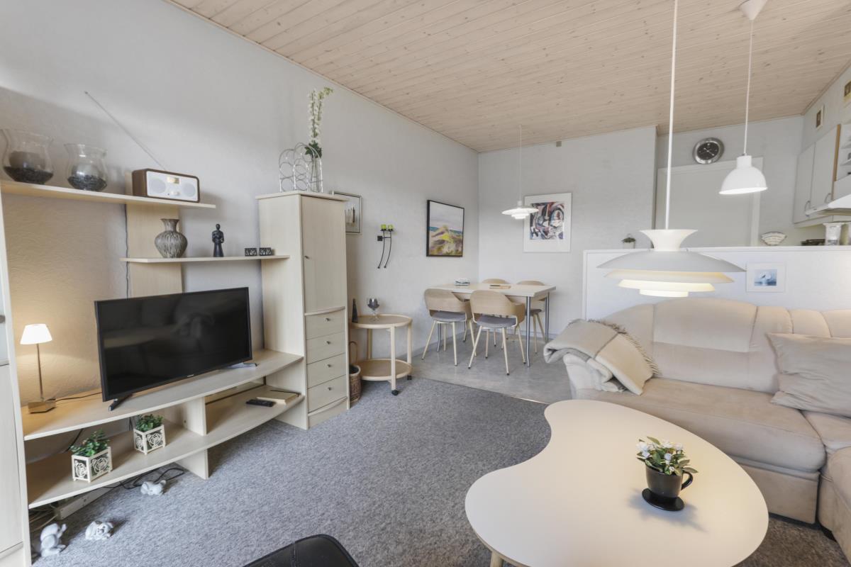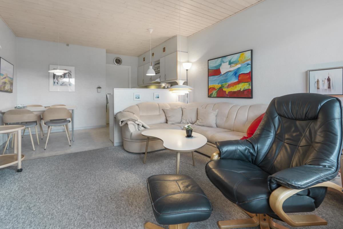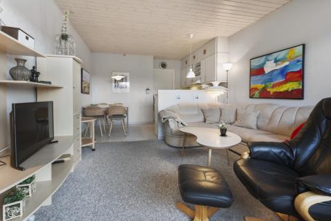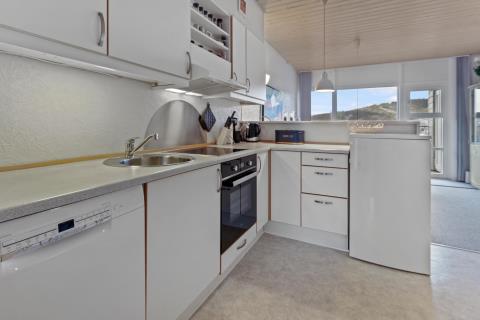 Nyrenoveret ferielejlighed til 4 personer beliggende på 1. sal. Indeholder soveværelse med en dobbeltseng og 1 enkeltseng, og kombineret køkken og stue. Stuen er indrettet med polster- og lædermøbler og sovesofa, radio og TV og nye spisestuestole. Køkkenet har keramisk el-kogeplade, stort køleskab med frostboks, emhætte samt ny indbygget ovn. Badeværelse med toilet, håndvask, brusekabine og gulvvarme.
