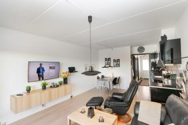 Meget pæn og moderne indrettet ferielejlighed til 2 personer, beliggende på 1. sal. Kombineret køkken og stue. Stuen er indrettet med lædermøbler, kabel-TV, og pergogulv. Køkkenet er indrettet med glaskeramisk kogeplade, indbygningsovn, køleskab med 10 l frostboks, opvaskemaskine, emhætte og pergogulv. Badeværelse med toilet, håndvask og bruser. 1 soverum: 2S og pergogulv. Fra stuen er der udgang til overdækket balkon med havemøbler. Trappen til 1. sal består af 14 trappetrin.
