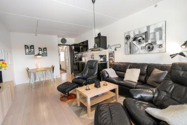Meget pæn og moderne indrettet ferielejlighed til 2 personer, beliggende på 1. sal. Kombineret køkken og stue. Stuen er indrettet med lædermøbler, kabel-TV, og pergogulv. Køkkenet er indrettet med glaskeramisk kogeplade, indbygningsovn, køleskab med 10 l frostboks, opvaskemaskine, emhætte og pergogulv. Badeværelse med toilet, håndvask og bruser. 1 soverum: 2S og pergogulv. Fra stuen er der udgang til overdækket balkon med havemøbler. Trappen til 1. sal består af 14 trappetrin.