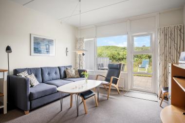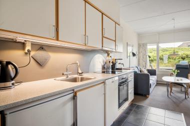 Rigtig pæn og hyggelig indrettet ferielejlighed med plads til 4 personer. Badeværelse med toilet, håndvask og bruser. Kombineret køkken og stue. Køkkenet er indrettet med glaskeramisk komfur, køleskab, emhætte, opvaskemaskine og klinkegulv. Stuen er med kabel-TV, cromecast, radio, læder og polstermøbler samt tæppe på gulvet. Sofaen kan slåes ud så der blir 2 sovepladser. Fra stuen er der udgang til lille delvis overdækket, indhegnet terrasse med havemøbler og parasol. 1 soverum: 1DS og 1S samt tæppe på gulvet.
