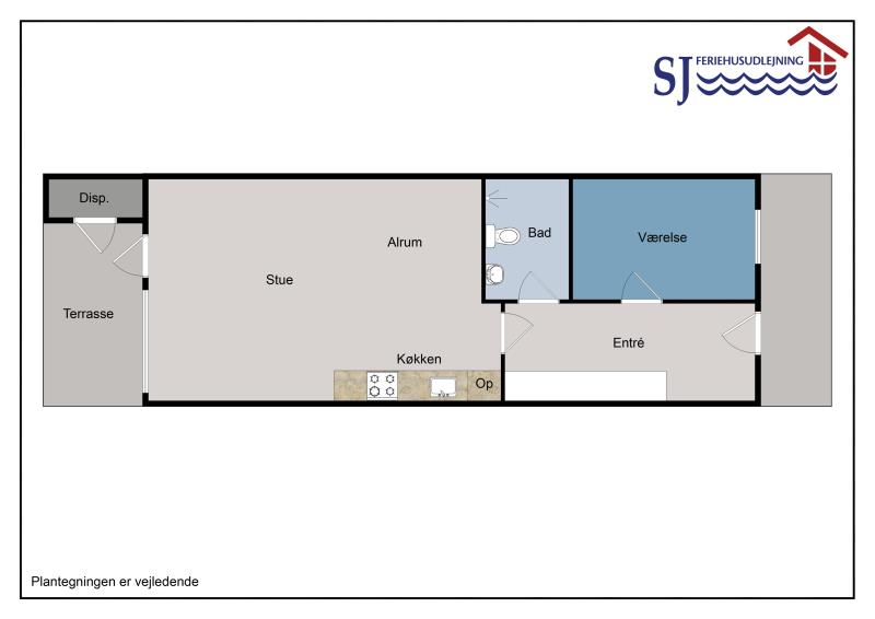 Meget hyggelig og pænt indrettet ferielejlighed til 4 personer. Kombineret stue og køkken. Køkkenet er indrettet med glaskeramisk komfur, emhætte, opvaskemaskine og køleskab med lille frostboks. Stuen er indrettet med trægulv, polstermøbler, radio, CD-afspiller, DVD og kabel-TV, sofaen i stuen kan slåes ud så der er plads til 2 personer. Fra stue er der udgang til lille indhegnet og delvis overdækket terrasse med havemøbler. 1 soverum: 1DS + 1ES. Badeværelse med håndvask, bruser og toilet.