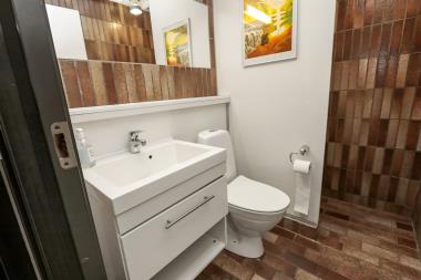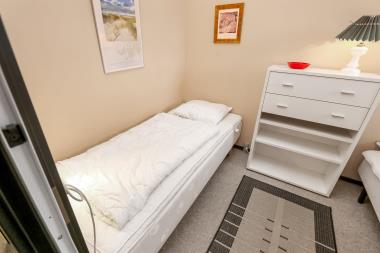 Pænt indrettet ferielejlighed i stueplan med plads til 4 personer. Kombineret køkken og stue med læder og polstermøbler, kabel-TV, DVD og CD-afspiller og gulvtæppe. Sofaen i stuen kan slåes ud så der er blir 2 sovepladser. 1 Soverum: 1DB + 1S og gulvtæppe. Badeværelse med toilet, håndvask og bruser. Køkkenafdeling med el-keramisk kogeplade, miniovn, opvaskemaskine, køleskab med lille frostbox og linoleumgulv. Fra stuen er der udgang til lille delvis overdækket terrasse med havemøbler.