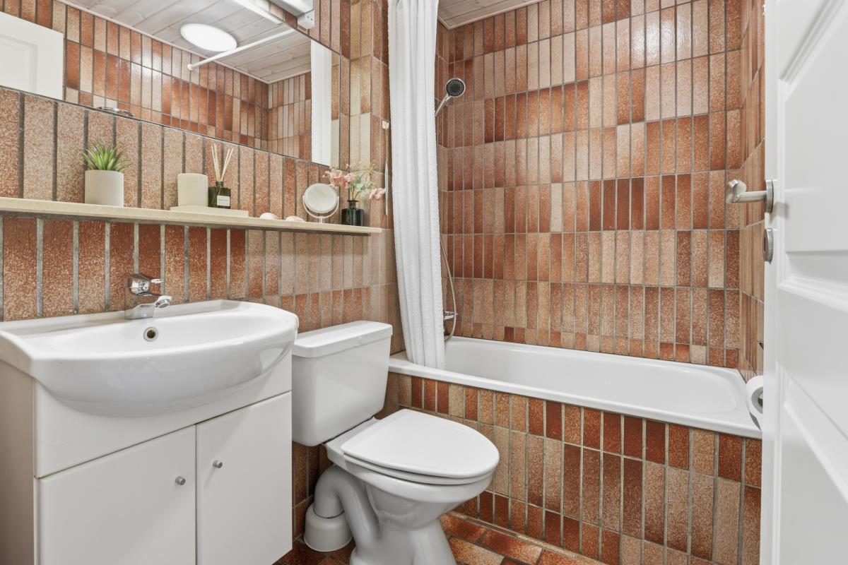 Badeværelset er udstyret med toilet, håndvask og badekar.