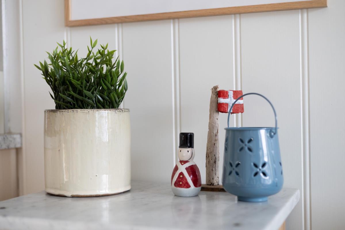 Soveværelset er indrettet i samme lyse og rolige stil med 160 cm bred seng, bløde tekstiler og hyggelige detaljer.