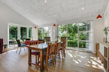 De 2 afdeling bindes sammen af et fantastisk, lyst og venligt opholdsrum det også var en del af tilbygningen fra 2019. Her findes der ekstra borde med kurvestole, bordfodbold og dart. Et unikt samlingspunkt for hele familien med mulighed for sjov og leg.