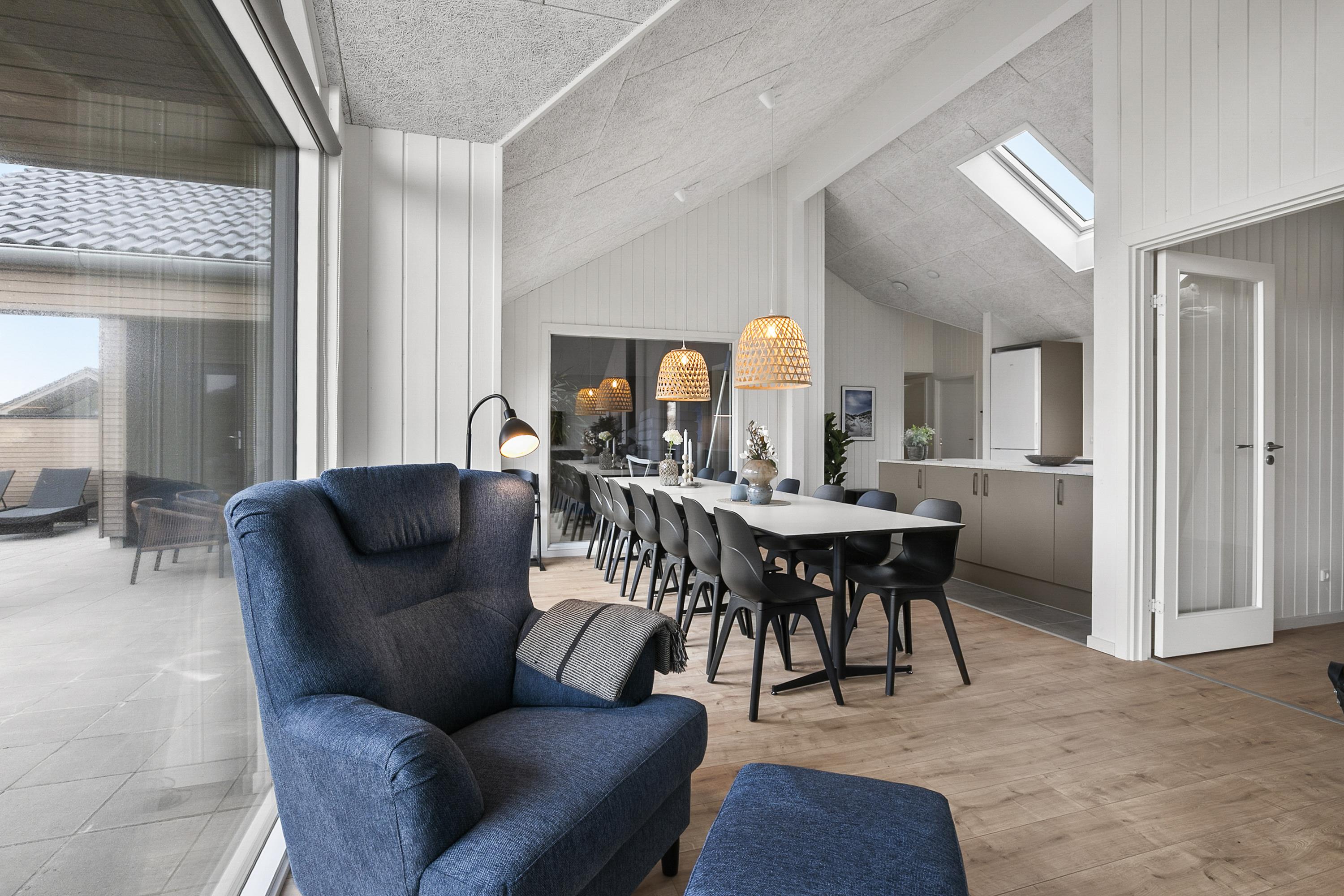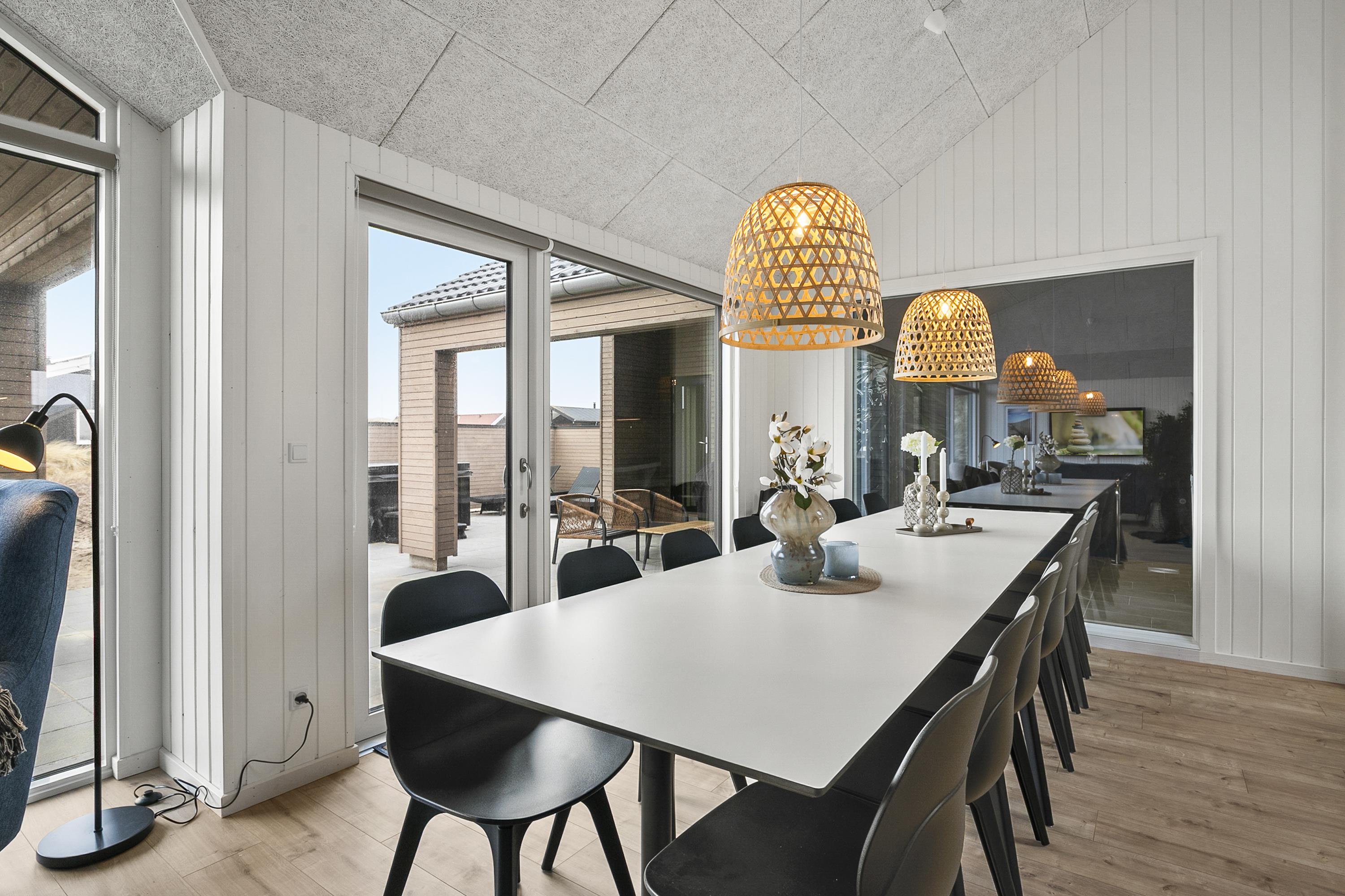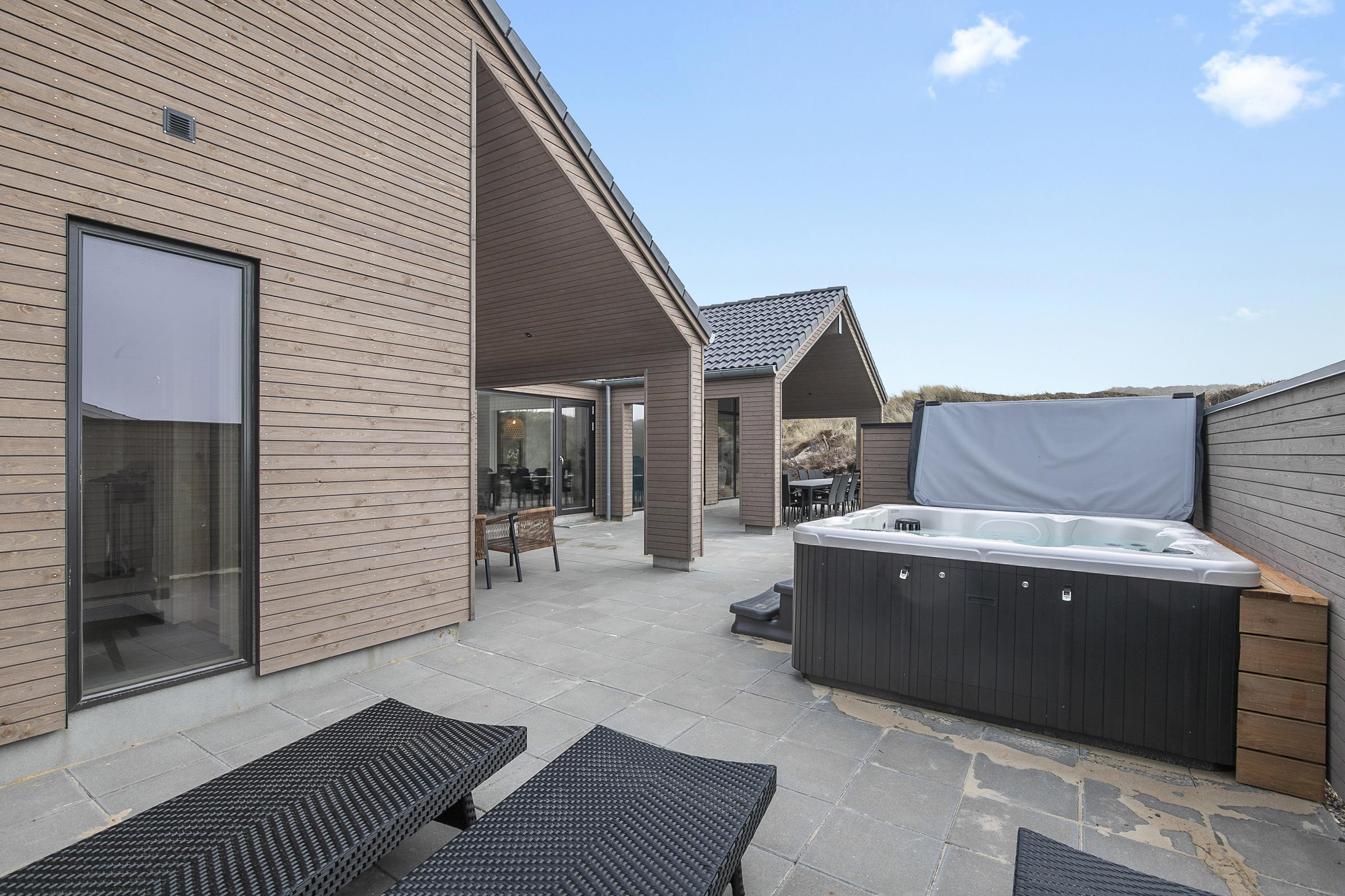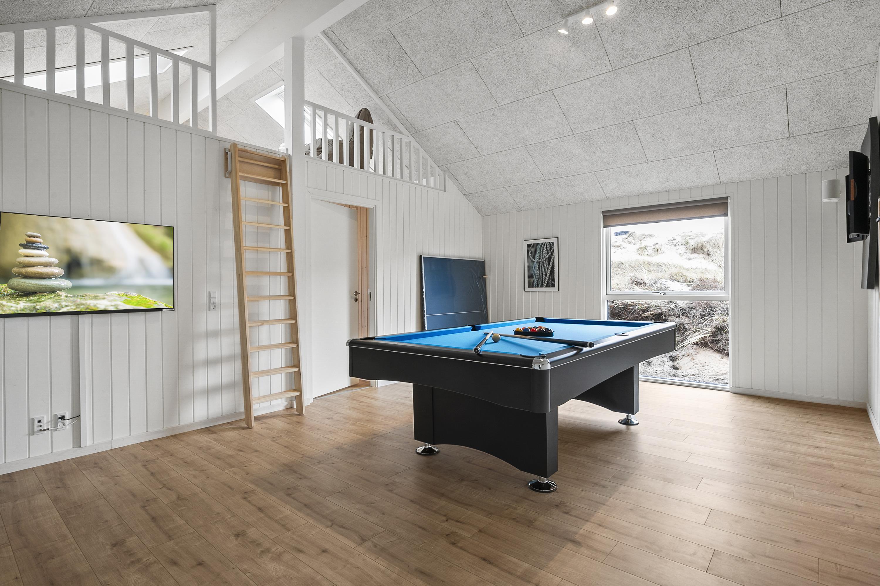 Dette indbydende feriehus i Hvide Sande er skabt til afslappende og oplevelsesrige ferier for op til 14 personer. Her får I både pool med børneområde, aktivitetsrum og et lækkert wellnessområde med udespa og sauna. Poolafdelingen er husets naturlige samlingspunkt, hvor både børn og voksne kan nyde ferien, og herfra er der direkte adgang til terrassen med wellness under åben himmel. Aktivitetsrummet byder på billard, bordtennis, dart og tv, mens opholdsrummet samler køkken, spiseplads og stue i hyggelige rammer med brændeovn. Den store terrasse indbyder til grill, afslapning og udeliv i al slags vejr. Beliggenheden i Hvide Sande giver jer nem adgang til strand, natur og autentisk vestkyststemning.