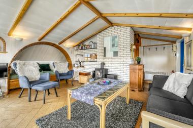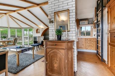 De sidste to sovepladser, findes for enden af huset i soveværelset. Her er der en stor dobbelt seng. Vær dog opmærksom på at loftshøjden i soveværelset er ca. 1,85 meter men kun 1,72 meter under bjælkerne.