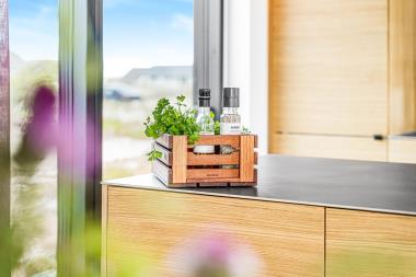 Fra entréen kommer man direkte ind i husets kernerum, som er en kombineret opholdsstue og køkken med høje lofter. Her er der plads til at alle husets gæster kan samles og nyde hinandens samvær. Nævneværdigt er feriehusets indretningsstil og materialesammensætning. Køkkenet består af egetræsfiner med stålbordplade og i hele opholdsrummet er der et blødt Epoxy PU-gulv. Køkkenet er udstyret med blandt andet køle-/fryseskab, opvaskemaskine, indbygningsovn, glaskeramiske kogeplader, emhætte og mikroovn. Her er alt, hvad man skal bruge til en ferie ved Vesterhavet. Stuehjørnet indbyder til filmhygge, da den er indrettet med lædermøbler og fjernsyn med den store pakke af fibernet-TV altså både danske og tyske kanaler. Desuden er der en Chromecast, hvorfra man kan streame egne streamingtjenester. Opholdsrummet kan opvarmes ved hjælp af en brændeovn, der skaber hygge og kan varme hele huset op på selv en kold og trist vinterdag.