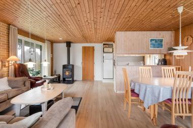 Huset er dejlig indrettet med klassisk opdeling af stue og soveafdeling. Stue og køkken er i samme rum og stuen har brændeovn, sofagruppe med sofabord, spisebord samt TV med DR og tyske kanaler samt radio. Køkkenet har glaskeramisk komfur, mikrobølgeovn, køleskab med separat fryser på 20 liter samt opvaskemaskine. Har man småfolk med er der både en barnestol og en barneseng i huset. Badeværelset i huset har bruser, håndvask og toilet, mens man skal søge hen i annekset for at benytte det andet badeværelse med både gulvvarme, sauna, håndvask, spabad, toilet og bruser. Der er desuden en vaskemaskine og tørretumbler i huset. De 3 soveværelser i huset fordeler sig med med 2 værelser i selve huset med henholdsvis en med 2 dobbeltsenge og een med 2 enkeltsenge. I annekset er der en dobbeltseng.