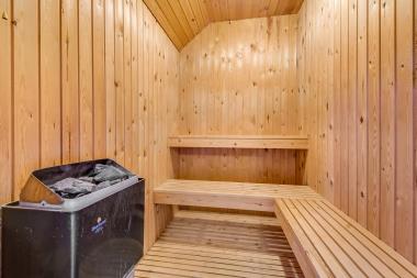 Dette rummelige feriehus er særdeles velindrettet og byder på en høj komfort. Der er hele to badeværelser med gulvvarme. Det ene badeværelse har direkte adgang til husets sauna, mens det andet ligger i forbindelse med et stort wellnessrum med en lækker 4-personers whirlpool. Begge badeværelser har flotte, rummelige brusenicher.