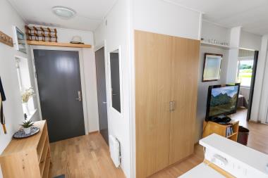 Køkkenet og stuen er i samme rum. Køkkenet har glaskeramisk komfur. Køle-/fryseskab og opvaskemaskine. I selve opholdstuen er der en varmepumpe. Hertil kommer der et Smart-TV hvor det kun er muligt at se TV igennem chromecast, som man selv skal have abonnement for at streame. Badeværelset har både bruser, toilet og håndvask, så her er hvad man har brug for. Der er en soveværelse i lejligheden. I det ene soveværelse er der en dobbeltseng og i stuen er der en sovesofa, som kan slås ud som dobbeltseng. I den ende af rummet med sovesofaen er der også via stige adgang til en hems som kan bruges til børn og barnlige sjæle. Fra stuen er der direkte udgang til den sydvendte balkon med havemøbler. Her er der basis for en hyggelig stund hvorfra man kan nyde udsigten over området både morgen, middag og aften. Har man el-bil eller en Plug-In hybrid, så er der 4 Ladebokse til Type 2 ladestik, der kan lade op til 11 kWh ved Feriecenteret – de er lige efter miljøstationen.