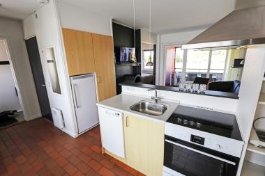Stue og køkken er i det samme rum. Køkkenet har det nødvendige såsom emhætte, elektrisk komfur, elkogeplader, køle-fryseskab og en arbejdslettende opvaskemaskine. I stuen er der en hyggelig sofa, kamin og fladskærms-tv. Her er kanalerne DR, TV2, tysk EUROSPORT1 og RTL. Herudover er der CD og radio. I rummet er der ligeledes en sovesofa, så man får 2 ekstra sengepladser. Soveværelset har dobbeltseng og badeværelset har gulvvarme, håndvask, bruser og toilet. Fra stuen er der udgang til den vestvendte balkon hvortil der findes havemøbler. Har man el-bil eller en Plug-In hybrid, så er der 4 Ladebokse til Type 2 ladestik, der kan lade op til 11 kWh ved Feriecenteret – de er lige efter miljøstationen.